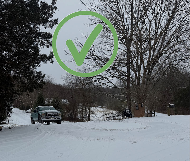 Our drive is 1/4 mile long. Don't turn left at the top of the hill (that goes to the neighbors). Continue on to the bottom of the hill where it dead ends.